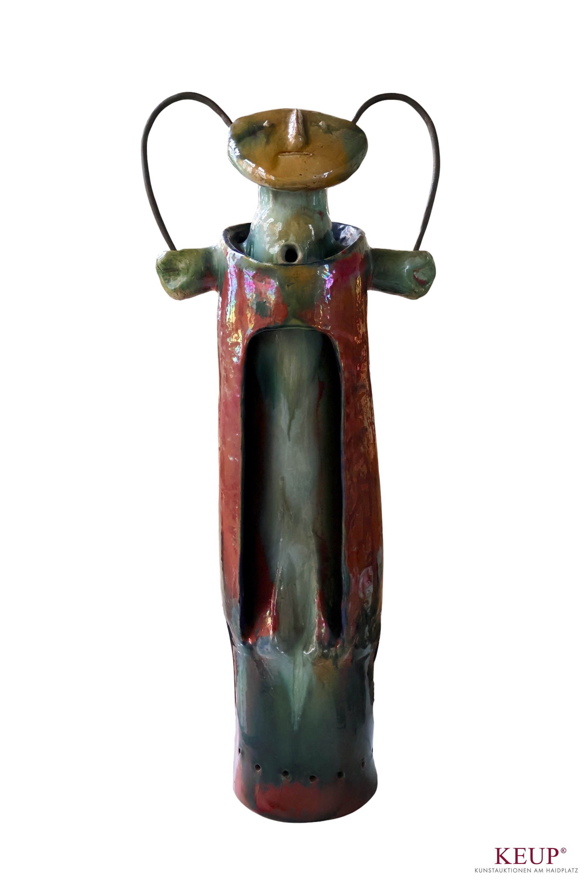 Große Figur - Peter Mayer (1938 Schwandorf / Bayern 2009) ''Ohne Titel'', monogrammiert und datiert (19)86, Terrakotta, Höhe ca. 95 cm, Provenienz: Private Oberpfälzer Kunstsammlung vgl. Literatur: Staatl. Fachschule für Keramik in Landshut, 1958-64 Akademie der Bildenden Künste München, seit 1964 freischaffender Bildhauer in Schwandorf 1974 Ostbayerischer Kulturpreis OBAG 1991, 94, 98 Stipendium und Aufenthalt im V.C.C.A, USA Ausstellungen: 1975 Miami Beach, I.C.S. Conv. 1976 Galerie Bürdecke, Zürich 1977 Kunstmesse Köln, Kunsthaus Lübeck 1978 Galerie Sphinx, Amsterdam 1984 Tassilo Galerie, Nürnberg 1984 Galerie im DEZ, Regensburg 1985 Galerie Lange Straße, Baden-Baden 1988 Oberpfälzer Künstlerhaus, Schwandorf 1992 Musée des Beaux-Arts, Libourne 1997 St. Anna Kapelle, Passau 1998 Kleine Galerie, Regensburg 1999 Kapuziner Stadl, Deggendorf Öffentliche Ankäufe / Kunst im öffentlichen Raum: Museum der Stadt Regensburg, Bay. Staatsgemäldesammlung München Universität Regensburg, Bezirk Oberpfalz, viele Arbeiten im öffentlichen Raum