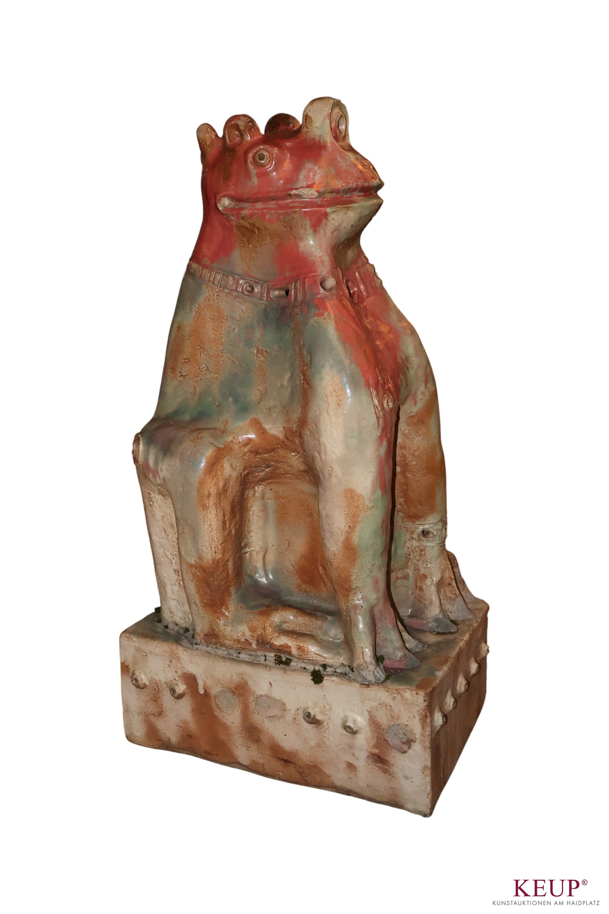 Figur - Peter Mayer (1938 Schwandorf / Bayern 2009) ''Fabelwesen'', monogrammiert, Terrakotta, Höhe ca.84 cm, Altersspuren, Provenienz: Private Oberpfälzer Kunstsammlung vgl. Literatur: Staatl. Fachschule für Keramik in Landshut, 1958-64 Akademie der Bildenden Künste München, seit 1964 freischaffender Bildhauer in Schwandorf 1974 Ostbayerischer Kulturpreis OBAG 1991, 94, 98 Stipendium und Aufenthalt im V.C.C.A, USA Ausstellungen: 1975 Miami Beach, I.C.S. Conv. 1976 Galerie Bürdecke, Zürich 1977 Kunstmesse Köln, Kunsthaus Lübeck 1978 Galerie Sphinx, Amsterdam 1984 Tassilo Galerie, Nürnberg 1984 Galerie im DEZ, Regensburg 1985 Galerie Lange Straße, Baden-Baden 1988 Oberpfälzer Künstlerhaus, Schwandorf 1992 Musée des Beaux-Arts, Libourne 1997 St. Anna Kapelle, Passau 1998 Kleine Galerie, Regensburg 1999 Kapuziner Stadl, Deggendorf Öffentliche Ankäufe / Kunst im öffentlichen Raum: Museum der Stadt Regensburg, Bay. Staatsgemäldesammlung München Universität Regensburg, Bezirk Oberpfalz, viele Arbeiten im öffentlichen Raum