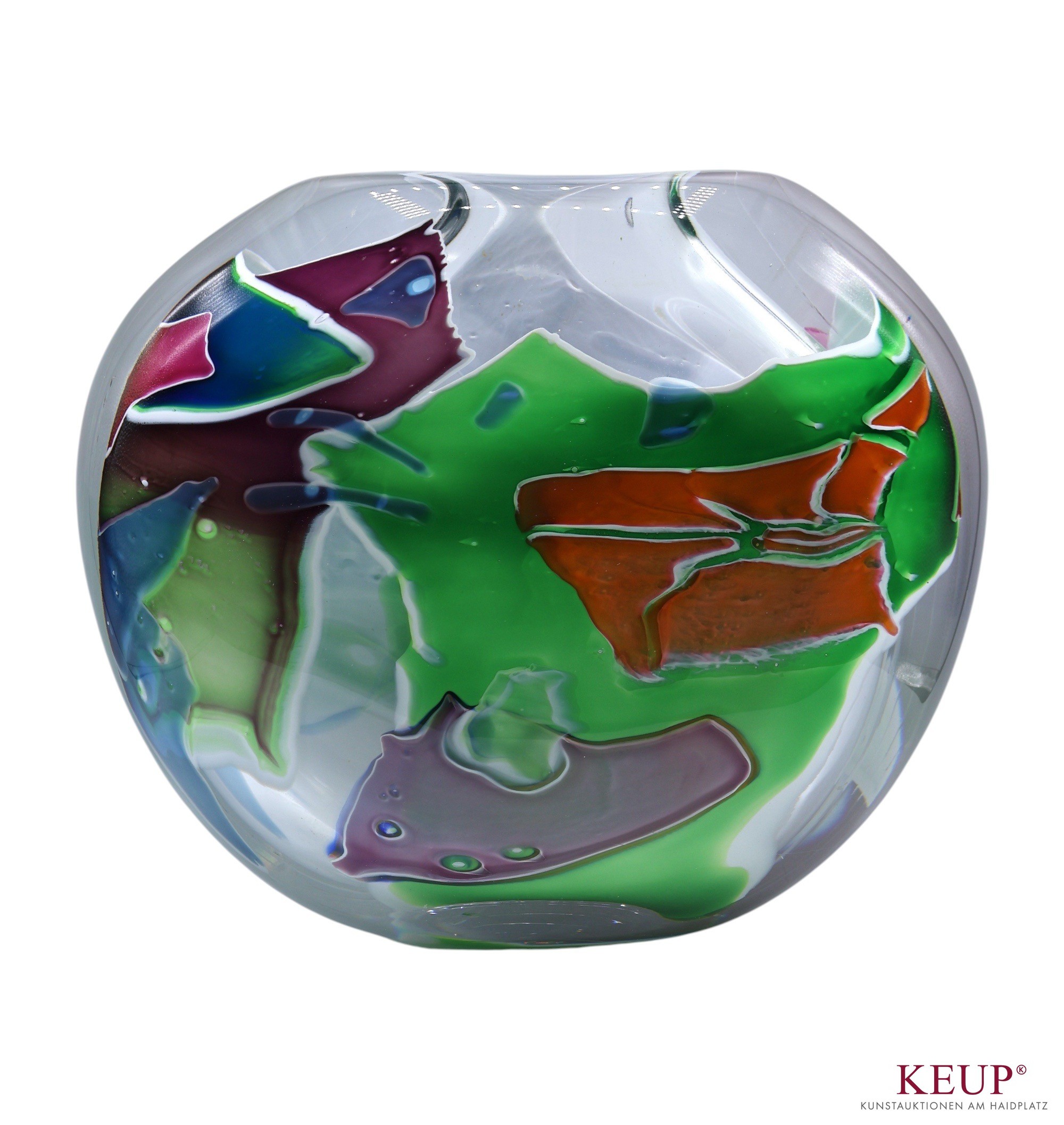 Glasobjekt - Pierre MARION (Annecy Frankreich 1954) Vase, signiert und datiert 1996, farbloses Glas mit bunten Einschmelzungen, schwere Ausführung, Höhe ca. 23 cm, Provenienz: Private Kunstsammlung Oberpfalz, vgl. Vita: besitzt seit 1981 sein eigenes Glasstudio in St. Galmier