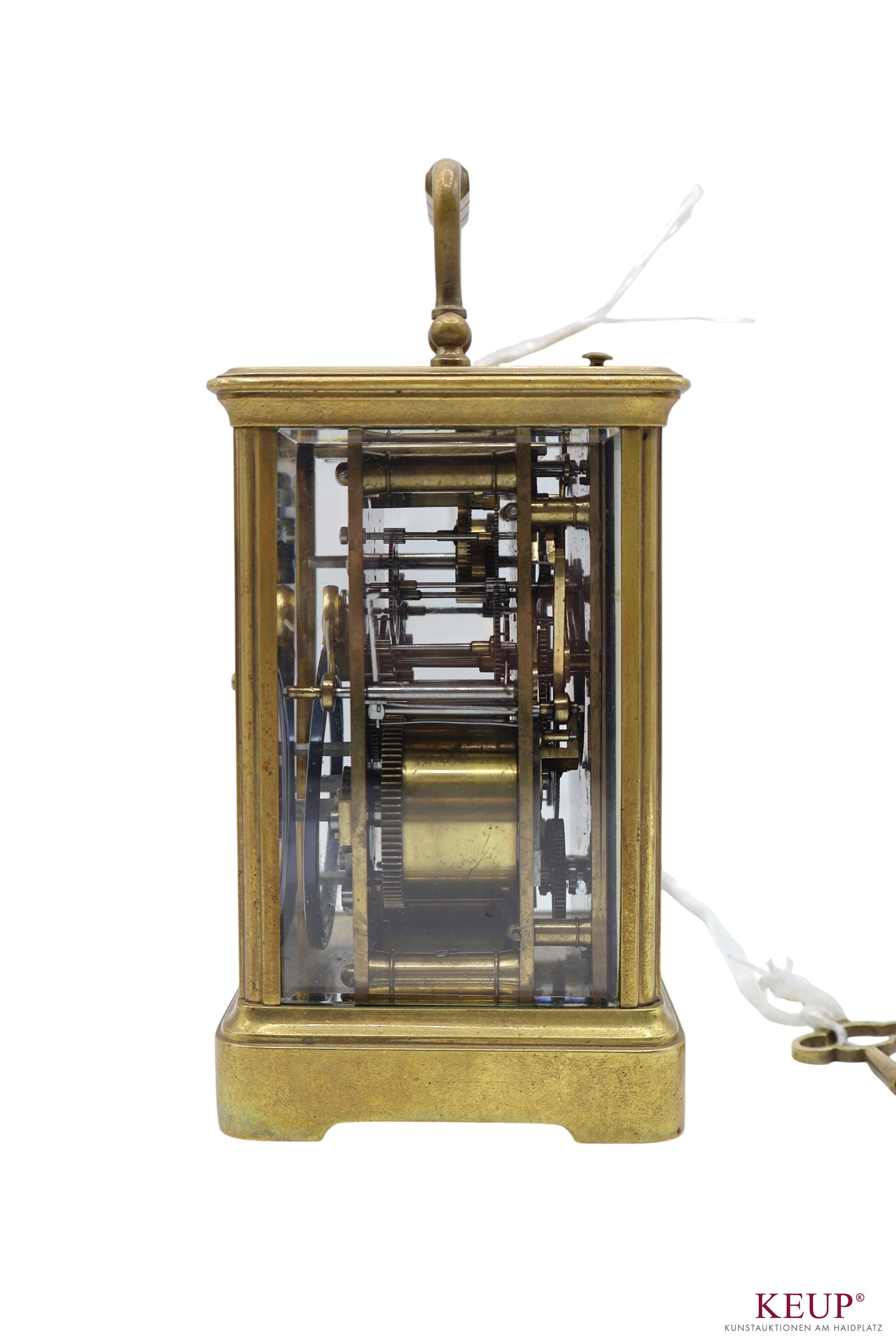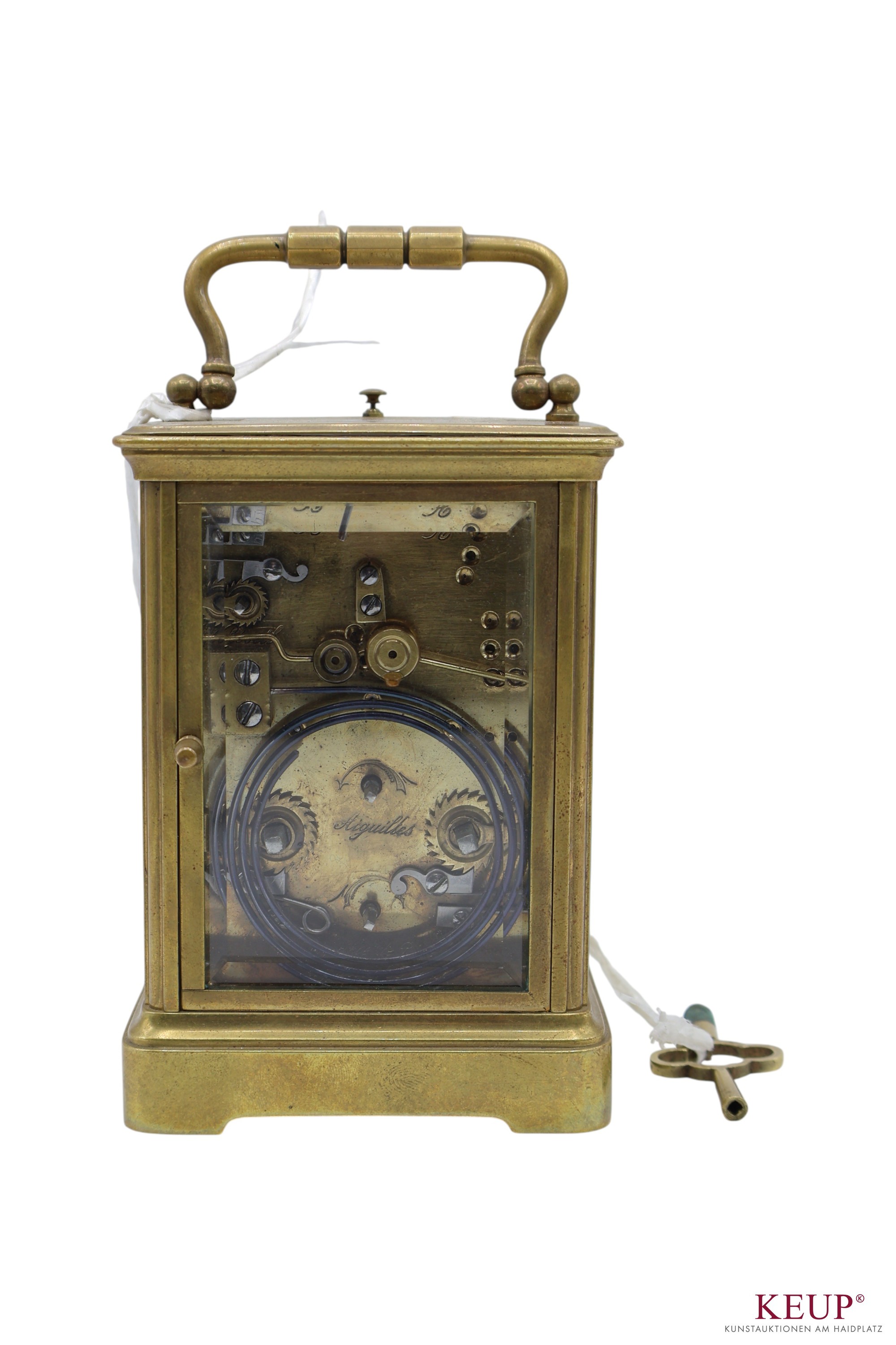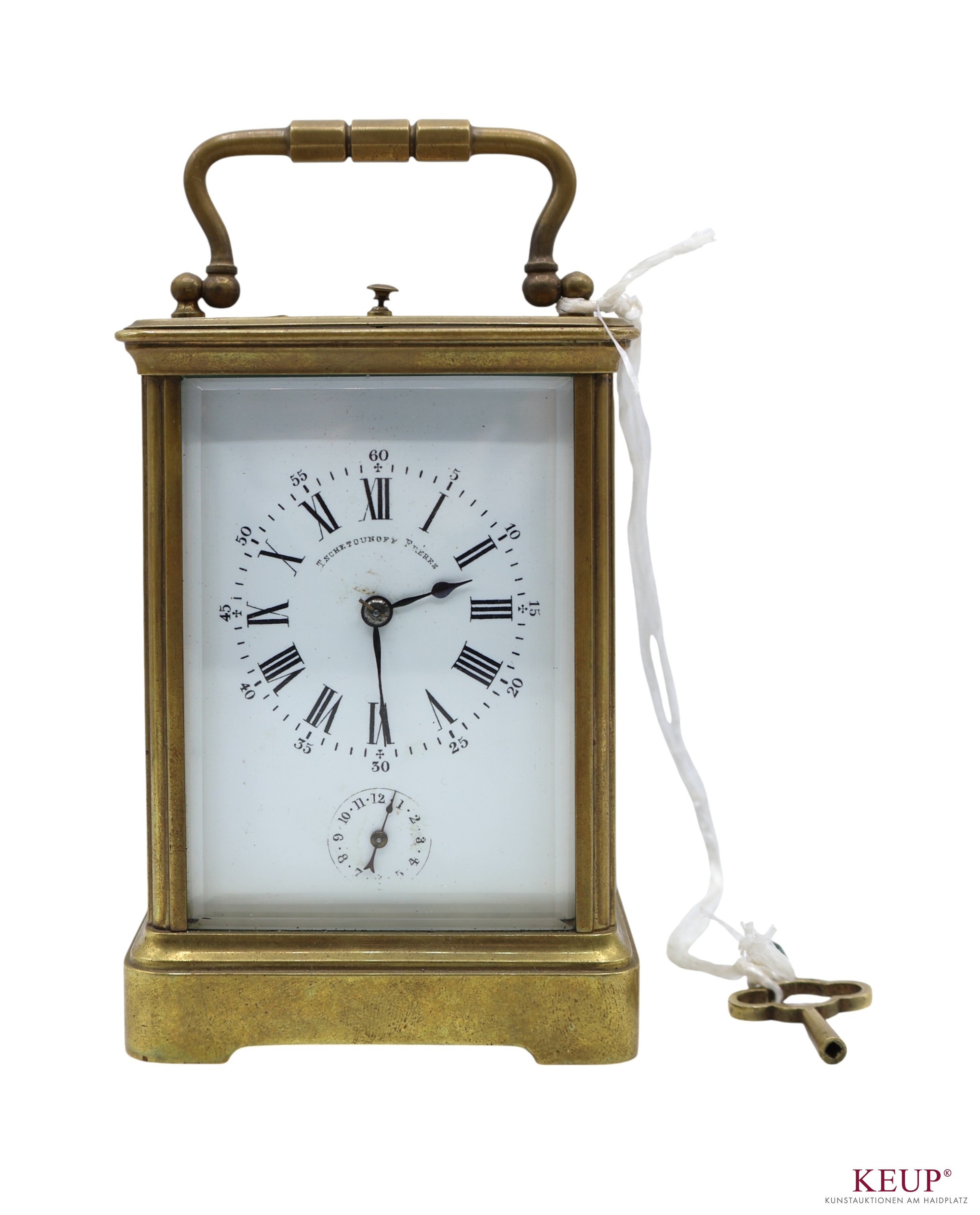 Reiseuhr - wohl Frankreich Ende 19.Jahrhundert beschriftet: T. Schetounoff Freres, rechteckiges Messinggehäuse, Tragehenkel, Zifferblatt mit römischen Zahlen, 8-Tage Werk mit Messingplatinen und Schlagwerk auf Tonfeder, Uhren werden nicht auf Gangbarkeit geprüft (muss überholt werden), Höhe ca. 13,5 cm, ca. 1678 Gramm, Provenienz: Regensburg