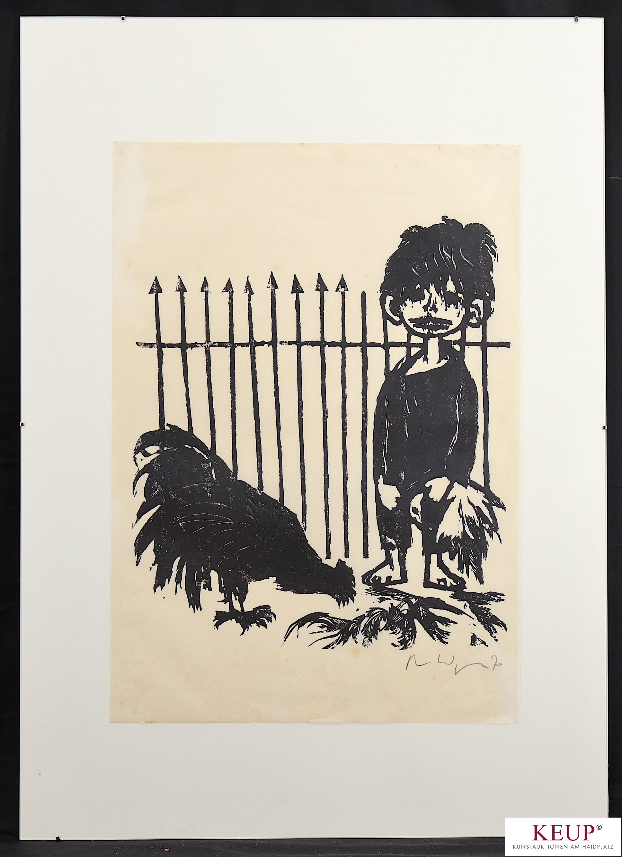 Holzschnitt - Robert WYSS (1925 Luzern - 2004 Adligenswil) ''Kind mit Henne am Zaun'', r.u. Bleistiftsignatur, Blattmaße ca. 49,5x35 cm, Provenienz: Privatbesitz Regensburg, vgl. Lit.: Schweizer Holzschneider, Grafiker und Kunstmaler; Schüler von Max von Moos an der Kunstgewerbeschule Luzern; Ende der 1940 Jahre ging er nach Paris an die Academie de la Grande Chaumiere; Er gehört zu den bekanntesten Holzschnitt-Künstlern der Schweiz; 1984 Kunst und Kulturpreis der Stadt Luzern