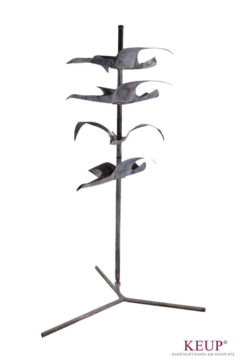 Figur - Rudi Weichmann (1926 Regensburg 2013) ''Brunnenfigur mit Vögeln'', Kupfer, Höhe ca. 146 cm, anbei Wasserbecken zum versenken (Länge ca. 155 cm.), Altersspuren, vgl. Lit.: War ein deutscher Metallbildhauer und Kunsthandwerker; Lehre zum Gold- und Silberschmied in Aachen; 1951-1955 Studium an der Akademie der Bildenden Künste München bei Franz Rickert und Bildhauerei bei Anton Hiller; 1973 Bayerischer Staatspreis, 1986 Nordgaupreis des Oberpfälzer Kulturbundes in der Kategorie ''Bildende Kunst'', 1991 Kulturpreis Ostbayern OBAG