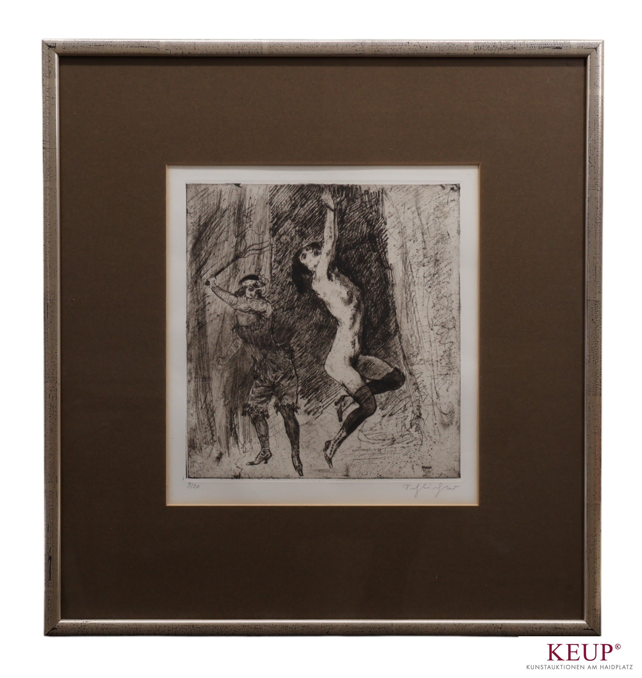 Radierung - Rudolf Schlichter (1890 Calw - 1955 München) ''Auspeitschung'', r.u. Bleistiftsignatur, Plattenmaße ca. 27x25 cm, Nr. 9/20, Passepartout, Rahmen, Gesamtmaße ca. 55x50 cm, vgl. Provenienz: Privatbesitz Landkreis Regensburg, vgl. Lit.: deutscher Künstler, Maler und Schriftsteller; Vertreter des Verismus innerhalb der Kunstrichtung Neue Sachlichkeit; 1910-916 Studium an der Kunstakademie in Karlsruhe; In der NS-Aktion ''Entartete Kunst'' wurden bis zu 17 seiner Werke beschlagnahmt.