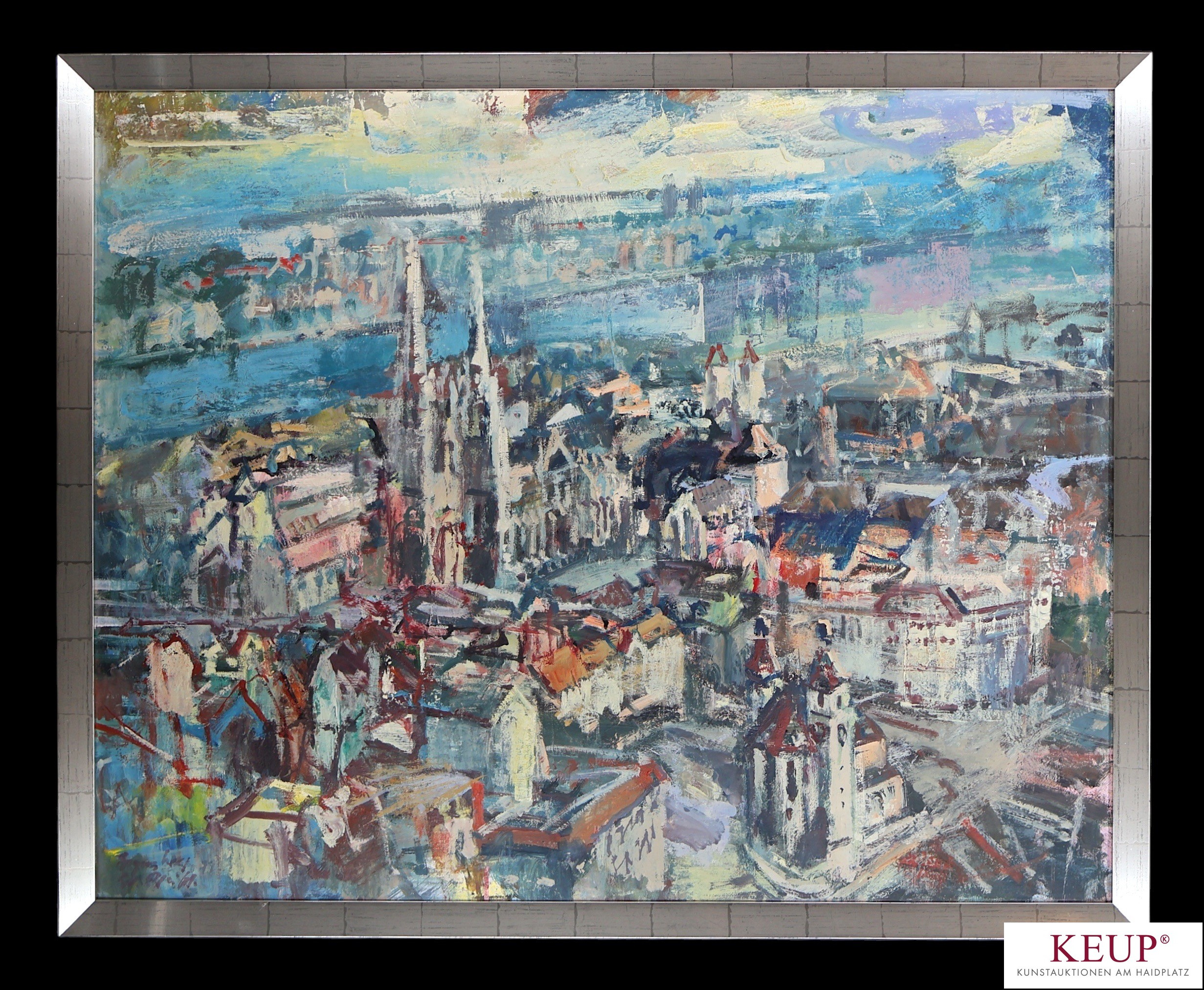 Großes Gemälde - Rupert Preissl (1925 Eitlbrunn bei Regensburg - 2003) ''Stadtansicht Regensburg'', signiert, ÖL auf Platte, Maße Darstellung ca. 80x100 cm, Rahmen, Provenienz: Regensburg, vgl. Lit.: Maler und Graphiker; erste künstlerische Ausbildung in Nürnberg bei Prof. H. Gradl, 1947-1952 Studium in München und Törwang bei Prof. Gerhardinger. Zusammenarbeit mit A.Kubin und W.Niedermayer. Preise: 1974 Kulturpreis Ostbayern; 1979 Kulturpreis Regensburg, 1984 Bundesverdienstkreuz 1.Klasse, 1991 Bayerischer Verdienstorden, etc.,,
