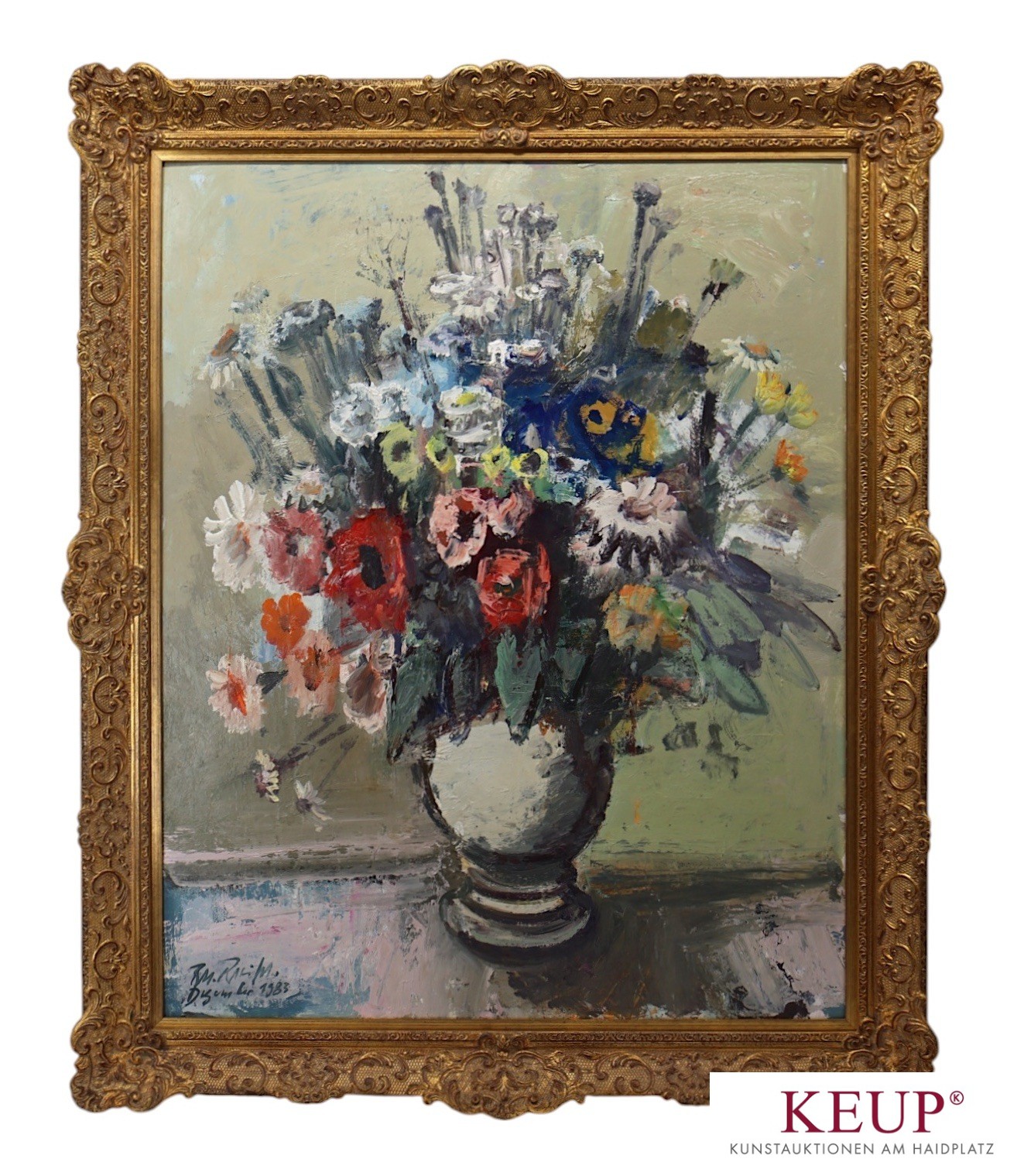 Gemälde - Rupert Preißl (1925 Eitlbrunn bei Regensburg - 2003) ''Stillleben'', r.u. signiert, datiert 1983, Öl auf Platte, Maße Darstellung ca. 100x80 cm, Rahmen, Gesamtmaße ca. 120x100 cm, Provenienz: Privatbesitz Amberg, vgl. Lit.: Maler und Graphiker; erste künstlerische Ausbildung in Nürnberg bei Prof. H. Gradl, 1947-1952 Studium in München und Törwang bei Prof. Gerhardinger. Zusammenarbeit mit A.Kubin und W.Niedermayer. Preise: 1974 Kulturpreis Ostbayern; 1979 Kulturpreis Regensburg, 1984 Bundesverdienstkreuz 1.Klasse, 1991 Bayerischer Verdienstorden, etc.,,