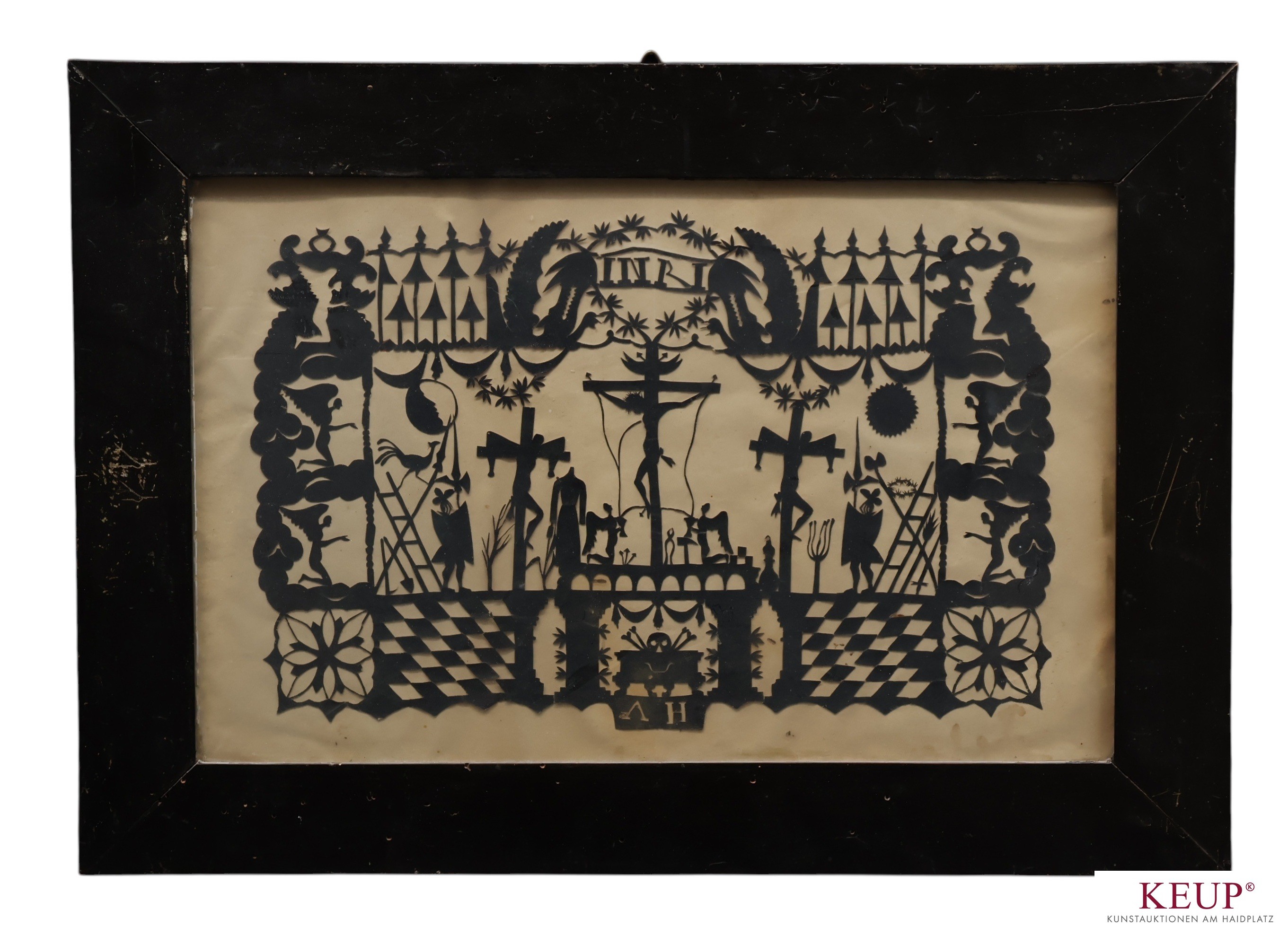 Scherenschnitt - 19.Jahrhundert ''Kreuzigung'', Monogramm AH, Maße Darstellung ca. 20x33 cm, Altersspuren, Rahmen, Gesamtmaße ca. 37x47 cm, Provenienz: Nürnberg