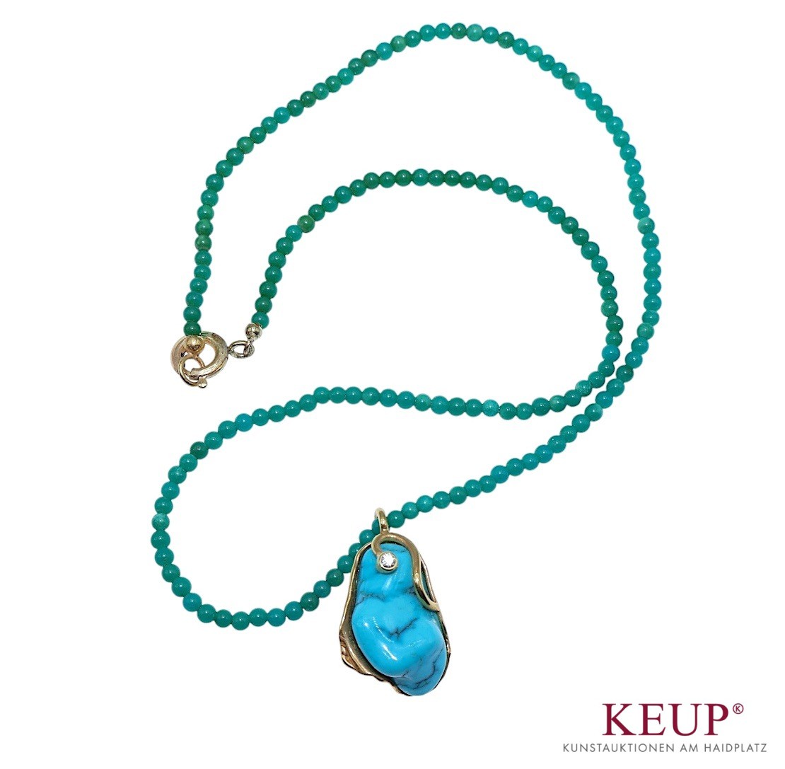 Anhänger - XX.Jahrhundert Türkis mit kleinem Brillanten, Gelbgoldfassung gest. 585 und WK?, Länge ca. 20 mm, an Kette, Provenienz: Privatbesitz Landkreis Regensburg