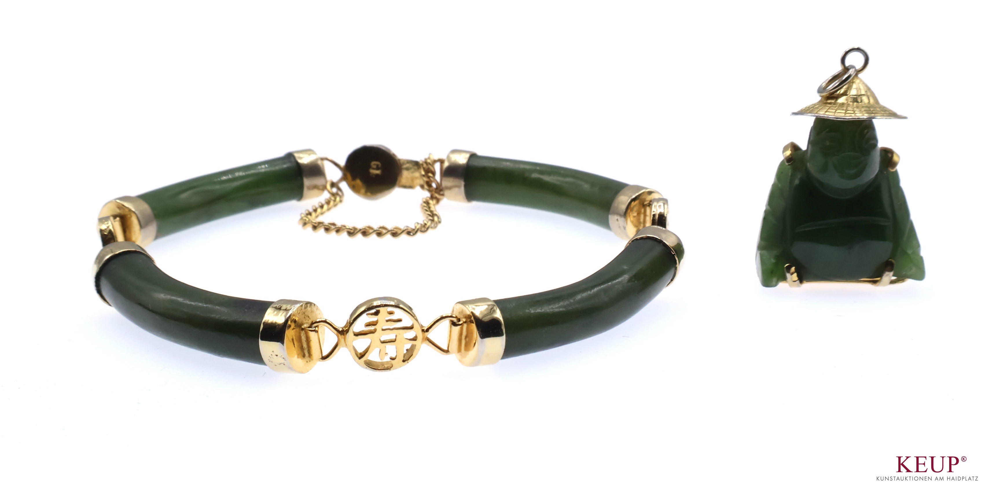 Schmuckset - XX.Jahrhundert bestehend aus Buddhaanhänger und Armband, Nephrit, vergoldete Montierung, 2 Stück, Provenienz: Privatbesitz Regensburg