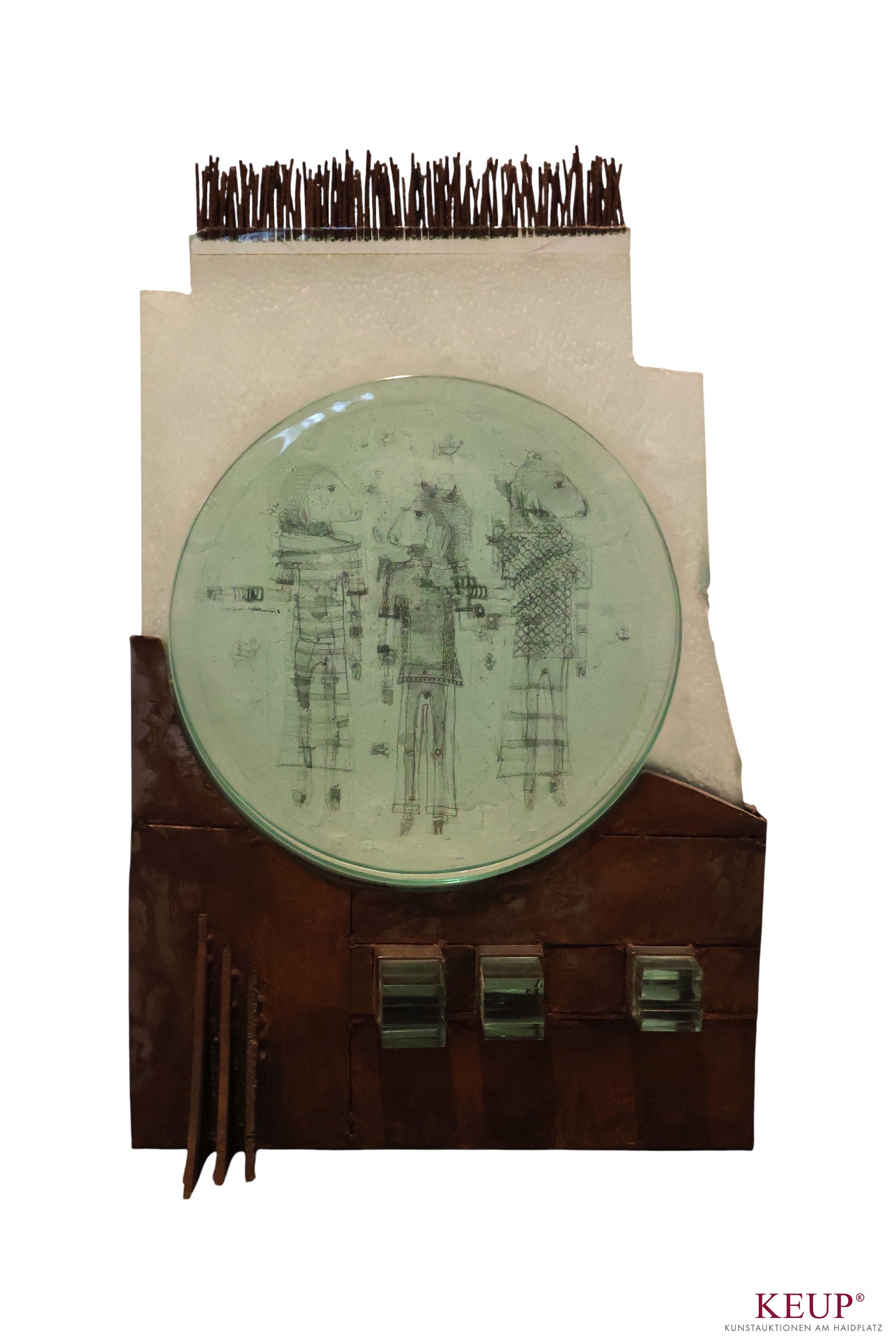 Große Skulptur - Stefan Stangl (1968 Frauenau) ''Ohne Titel'', Schale mit eingeschmolzener Zeichnung ''Sheepfamily'', Glas und Metall, Maße ca. 60x38x18 cm, Provenienz: Private Kunstsammlung Oberpfalz, vgl. Lit.: 1983-1986 Ausbildung als glasmaler in der glashütte valentin eisch / frauenau, 1986-1992 als glasmaler im ausbildungsbetrieb tätig / abteilung poesiemalerei, 1991 mitbegründer des atelier ''männerhaut '' in frauenau, 1992-1994 weiterbildung zum glasgestalter an der glasfachschule zwiesel bei f.x.höller, 1995 selbständig als glasgestalter / glaskünstler, seit 1997 nebenberufliche lehrtätigkeit an der glasfachschule zwiesel / abteilung schmelztechniken, 1998 eröffnung der galerie männerhaut in zwiesel ausstellungsbeteiligungen, 1992 passau - kulturmodell bräugasse, 1994 frauenau - gruppenausstellung männerhaut im glasmuseum, 1999-2007rudersberg - weru glaskunstpreis, 1999-2006 zwiesel - düsseldorf - frankfurt - maastricht - gladbeck, 2001 frauenau - 10 jahre männerhaut - galerie am museum, 2006 coesfeld/lette - glasmuseum alter hof herding, 2008 glass inspiration / schweiz, 2008 same difference - galerie am museum / frauenau, 2009 bhs zentrum weiherhammer /oberpfalz, 2009 ccaa glasgalerie köln, 2009 ausstellungsbeteiligung USA/ corning, 2010 gläserne gärten von frauenau, 2012 zwiesler buntspecht, 2013 harlachberg - bodenmais, auszeichnungen; 1993 ehrendiplom beim 3. bayerwald glaspreis, 1995 3.platz - designnachwuchswettbewerb / hannover, 2000 sonderpreis - weru glaskunstpreis, 2001 jury sonderpreis - weru glaskunstpreis, 2004 preisträger - pöschl glaspreis, 2008 preisträger - pöschl glaspreis, arbeiten in öffentlichen sammlungen: 2006 glasmusem alter hof herding - ernstingstiftung, 2007 glasmuseum frauenau