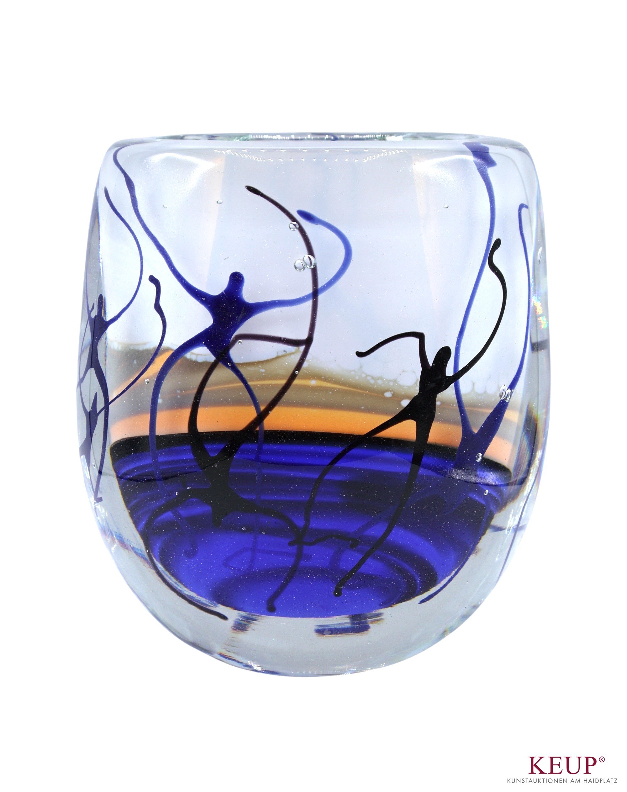 Glasobjekt - Theodor SELLNER (1947 Zwiesel 2025) Kugelvase, farbloses Glas mit bunten Einschmelzungen, Figurenstaffage, unsigniert, Höhe ca. 20,5 cm, schwere Ausführung, Provenienz: private Kunstsammlung Oberpfalz, vgl. Lit.: deutscher Glaskünstler, Mitbegründer der Studioglasbewegung; 1978/79 Studienaufenthalte in Murano bei Aldo Nason; in Mount Vernon bei Robert Coleman, in Corning (New York) und in Sandefjord bei Jan Erikson; seit 1990 Gastdozent am Institut für Werkstoffwissenschaften der Universität Erlangen unter der Leitung von Herbert Oel; Kursleiter im Bildwerk Frauenau und hielt Vorträge in Lwiw an der Akademie der bildenden Künste: Teilnahme an internationalen Symposien wie dem World Crafts Council in Wien; Bayerischer Staatspreis, Großer Ostbayerischer Kulturpreis der e.on Bayer AG; Bayerwald Glaspreis;