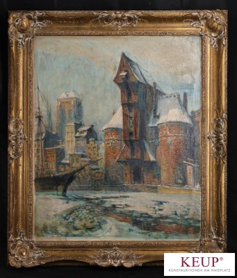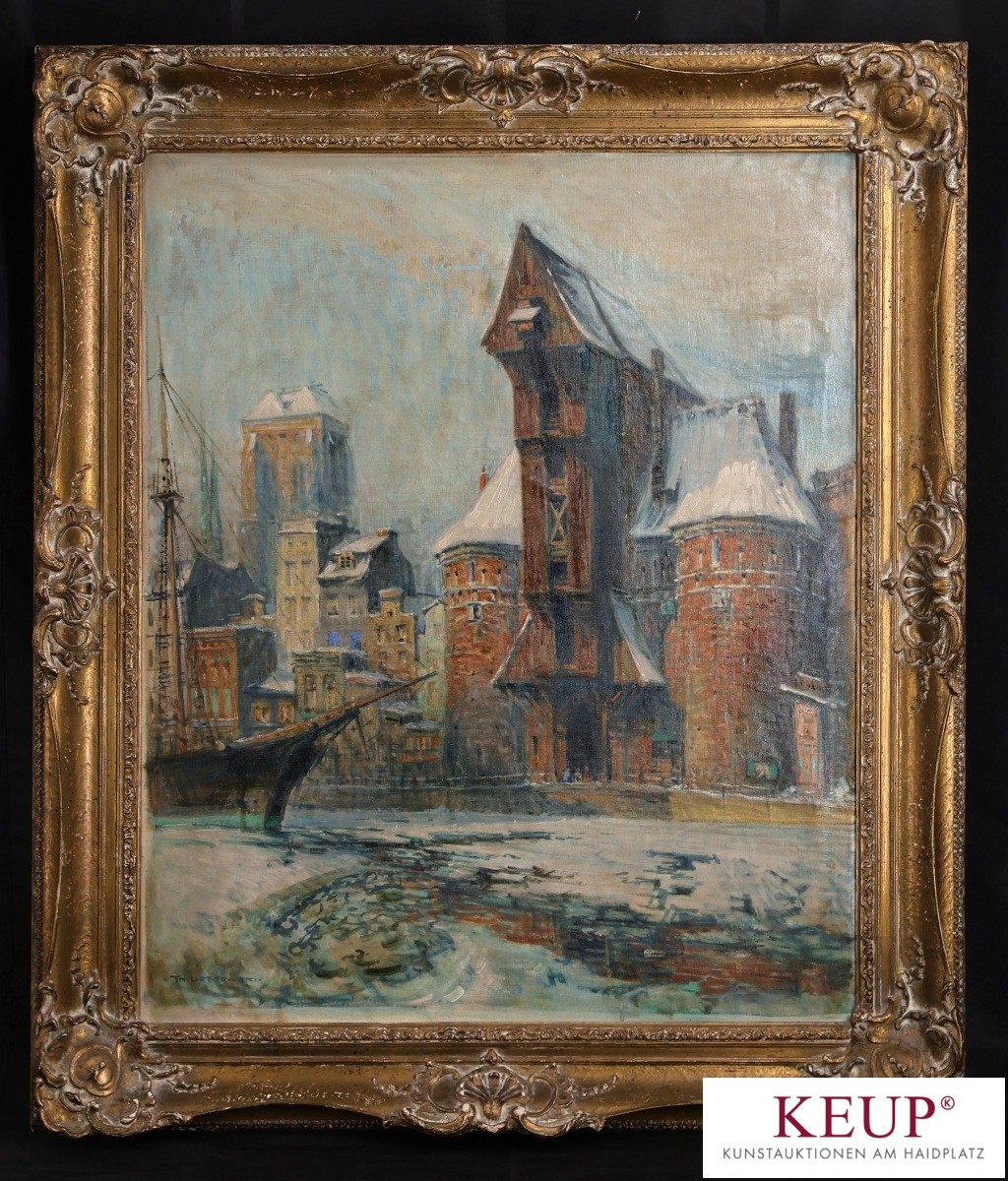 Gemälde - Theodor URTNOWSKI (1881 Torun - 1963 Danzig) ''Winterliche Stimmung in Danzig - Gdansk nad Motlawa'', l.u. signiert, Öl auf Leinwand, Maße Darstellung ca. 80x65 cm, Altersspuren, Rahmen, Gesamtmaße ca.100x86 cm, Provenienz: Privatsammlung Oberpfalz, vgl.Lit.: Schüller von Albert Maennchen in Berlin