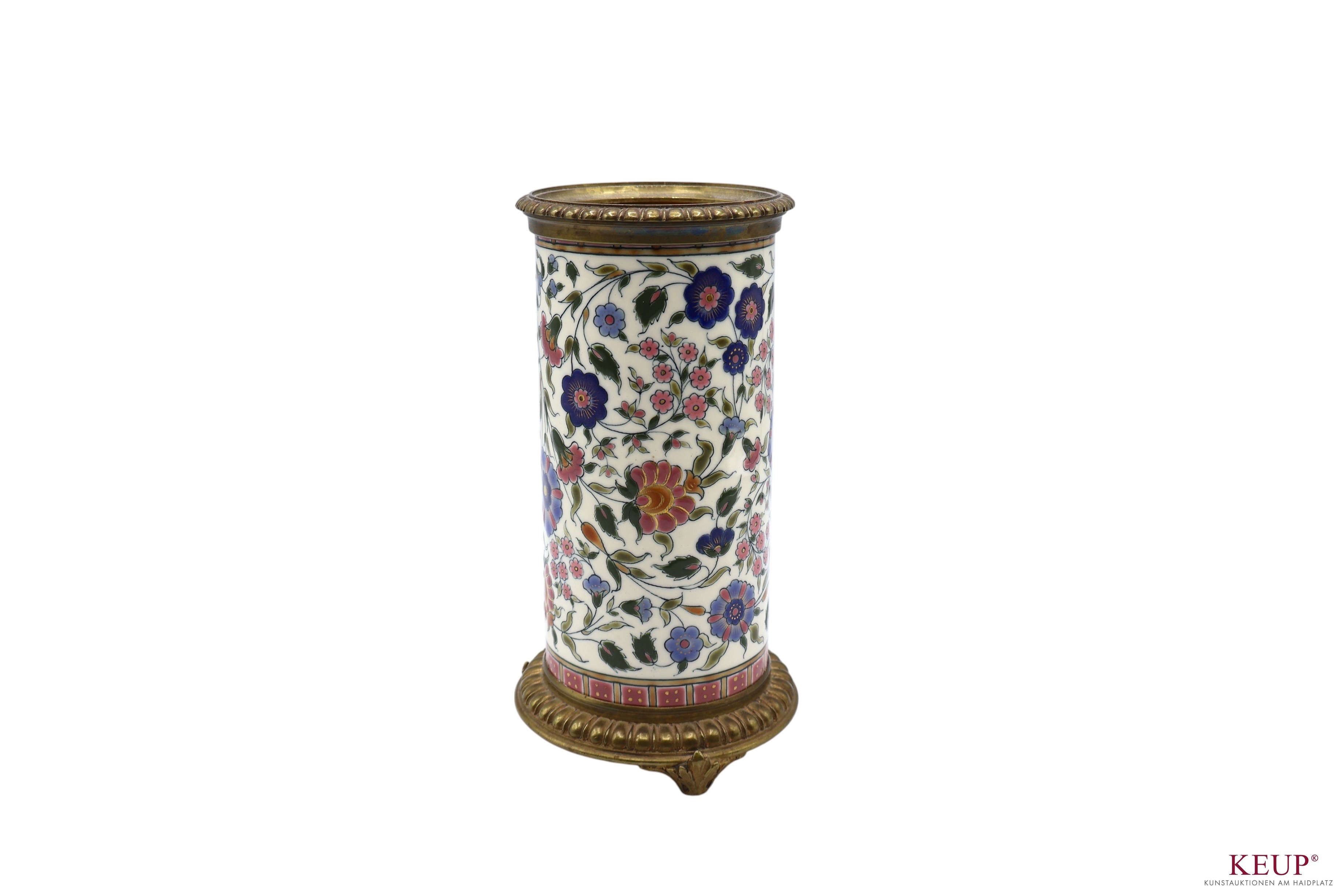 Vase - wohl Zsolnay Ende 19.Jahrhundert Keramik mit floralem Dekor, Messingmontierung, Höhe ca. 15 cm, Provenienz: Privatbesitz Regensburg