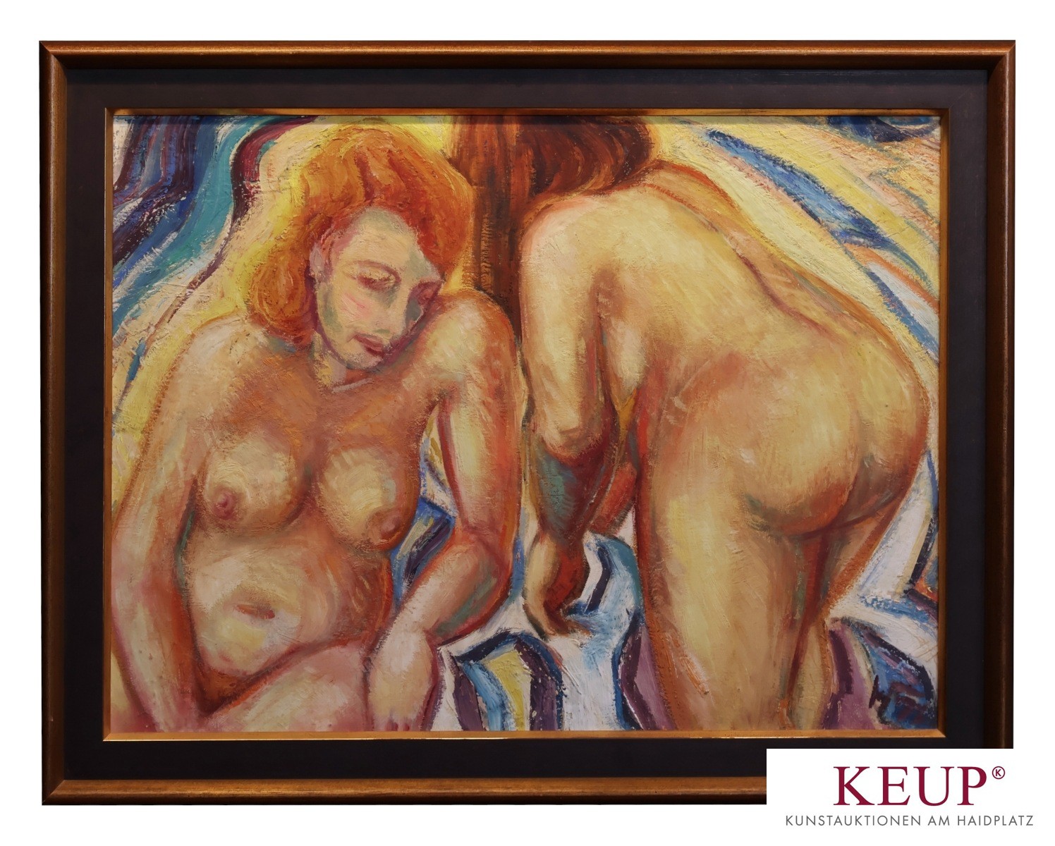 Gemälde - Wilhelm Niedermayer (1899 Passau - 1965 Englburg) ''Frauenbad II, Frauen in den Dünen'', r.u. monogrammiert, rückseitig datiert (19)45, Öl auf Hartfaserplatte, Maße Darstellung ca. 58x78 cm, Provenienz: Privatbesitz Niederbayern, vgl. Lit.: Studierte ab 1918 Landwirtschaft an der TU München-Weihenstephan und schloss die Examen 1921 ab. Parallel hörte er Vorlesungen über moderne Malerei insbesondere die französischen Impressionisten bei Prof. Popp. Nach dem Studium trat er in die Münchener Zeichen- und Malschule Moritz Heymann ein. Hier wurde er in der Akt-, Portrait- und Landschaftsmalerei unterrichtet. Danach setzte er seine Ausbildung bei Prof. Hermannsdörfer und Peter Trumm fort. Um sich ganz der Malerei hingeben zu können, zog Wilhelm Niedermayer fest nach München. In diesen ''Bohème-Jahren'' lebte er im Kreis des Simplicissimus, der berühmten satirischen Zeitschrift des Albert-Langen-Verlags. Die finanzielle Situation war prekär. Eine erste Ausstellung im Münchner Glaspalast machte ihn 1927 einer breiteren Öffentlichkeit bekannt. Es folgten Studienreisen nach Ostfriesland, Worpswede, Böhmen, Italien und Dalmatien, aber erst im Pariser Studienaufenthalt 1926/1927 wurde die Beschäftigung mit Impressionismus und Expressionismus für sein Werk bestimmend. Seit 1931 lebte Wilhelm Niedermayer in Englburg im sogenannten ''Malerhäusl''. In der streng realistischen Darstellung seiner Motive waren sozial- und gesellschaftskritische Elemente nicht zu verkennen. Deshalb stand er in der Zeit des Nationalsozialismus spätestens ab 1936 unter politischer Überwachung. Als Gründungsmitglied der Donau-Wald-Gruppe zählte Wilhelm Niedermayer neben Hermann Erbe-Vogel, August Philipp Henneberger, Reinhold Koeppel, Walter Mauder, Heinz Theuerjahr und Georg Philipp Wörlen zu den Wegbereitern der künstlerischen Szene in Ostbayern nach dem Zweiten Weltkrieg.1963 wurden sein Werk und seine Verdienste durch den Kulturpreis Ostbayern geehrt.,