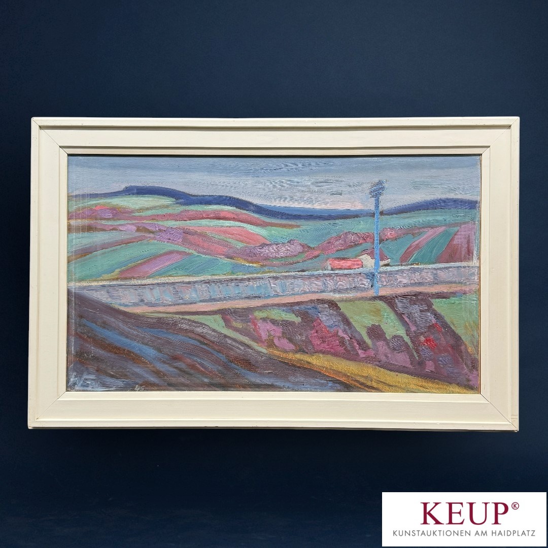 Gemälde - Wilhelm Niedermayer (1899 Passau - 1965 Englburg) ''Bahndamm im November'', l.u. monogrammiert und datiert (19)45, rückseitig signiert und bezeichnet, Öl auf Karton, Maße Darstellung ca. 33x57 cm, Provenienz: Privatbesitz Niederbayern, vgl. Lit.: Studierte ab 1918 Landwirtschaft an der TU München-Weihenstephan und schloss die Examen 1921 ab. Parallel hörte er Vorlesungen über moderne Malerei insbesondere die französischen Impressionisten bei Prof. Popp. Nach dem Studium trat er in die Münchener Zeichen- und Malschule Moritz Heymann ein. Hier wurde er in der Akt-, Portrait- und Landschaftsmalerei unterrichtet. Danach setzte er seine Ausbildung bei Prof. Hermannsdörfer und Peter Trumm fort. Um sich ganz der Malerei hingeben zu können, zog Wilhelm Niedermayer fest nach München. In diesen ''Bohème-Jahren'' lebte er im Kreis des Simplicissimus, der berühmten satirischen Zeitschrift des Albert-Langen-Verlags. Die finanzielle Situation war prekär. Eine erste Ausstellung im Münchner Glaspalast machte ihn 1927 einer breiteren Öffentlichkeit bekannt. Es folgten Studienreisen nach Ostfriesland, Worpswede, Böhmen, Italien und Dalmatien, aber erst im Pariser Studienaufenthalt 1926/1927 wurde die Beschäftigung mit Impressionismus und Expressionismus für sein Werk bestimmend. Seit 1931 lebte Wilhelm Niedermayer in Englburg im sogenannten ''Malerhäusl''. In der streng realistischen Darstellung seiner Motive waren sozial- und gesellschaftskritische Elemente nicht zu verkennen. Deshalb stand er in der Zeit des Nationalsozialismus spätestens ab 1936 unter politischer Überwachung. Als Gründungsmitglied der Donau-Wald-Gruppe zählte Wilhelm Niedermayer neben Hermann Erbe-Vogel, August Philipp Henneberger, Reinhold Koeppel, Walter Mauder, Heinz Theuerjahr und Georg Philipp Wörlen zu den Wegbereitern der künstlerischen Szene in Ostbayern nach dem Zweiten Weltkrieg.1963 wurden sein Werk und seine Verdienste durch den Kulturpreis Ostbayern geehrt.,