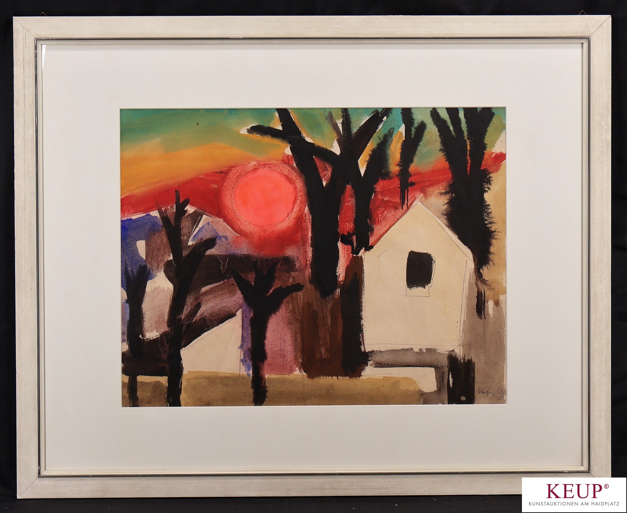 Aquarell - Willi Ulfig (1910 Breslau - 1983 Regensburg) ''Abendrot'', r.u. signiert, datiert (19)52, lasierende Farben auf Papier, Maße 43x56 cm, Passepartout, Rahmen, Gesamtmaße ca. 70x86 cm, Privatsammlung Regensburg, vgl. Lit. W.Amann: 1929 Studium an der Kunstakademie Breslau. Zwischen 1940 und 1945 sind alle seine Arbeiten durch Kriegseinwirkungen zerstört worden. Preise: 1965 Ostbayerischer Kulturpreis, 1971 Silb. Lamm, Brixen, 1974 Kulturpreis der Stadt Regensburg, etc.