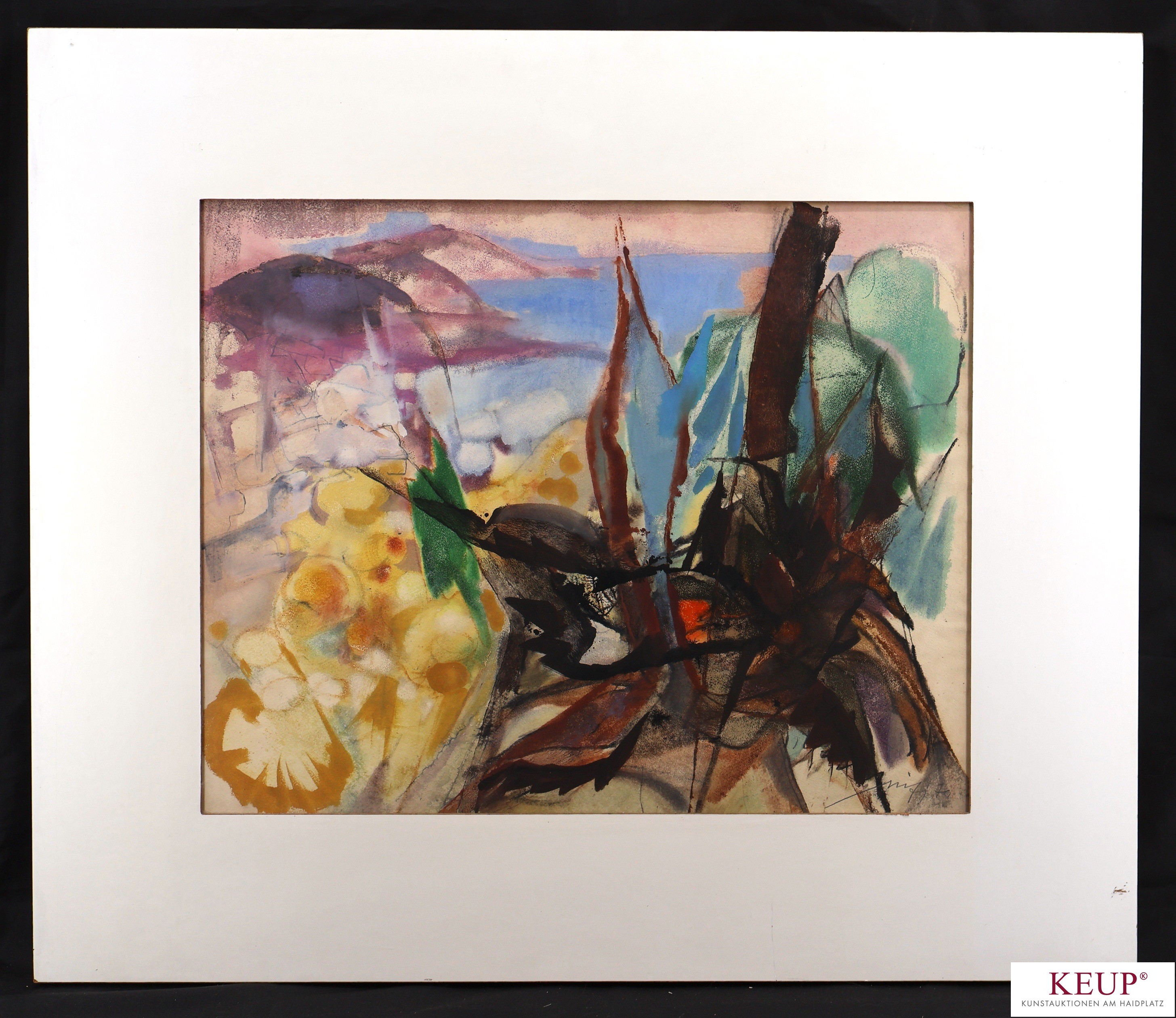 Aquarell - Willi Ulfig (1910 Breslau - 1983 Regensburg) ''Moderne Landschaft'', r.u. signiert, datiert (19)70, lasierende Farben auf Papier, Maße ca. 47x60 cm, Rahmen, Gesamtmaße ca. 73x85 cm, Provenienz: Privatsammlung Regensburg, vgl. Lit. W.Amann: 1929 Studium an der Kunstakademie Breslau. Zwischen 1940 und 1945 sind alle seine Arbeiten durch Kriegseinwirkungen zerstört worden. Preise: 1965 Ostbayerischer Kulturpreis, 1971 Silb. Lamm, Brixen, 1974 Kulturpreis der Stadt Regensburg, etc.