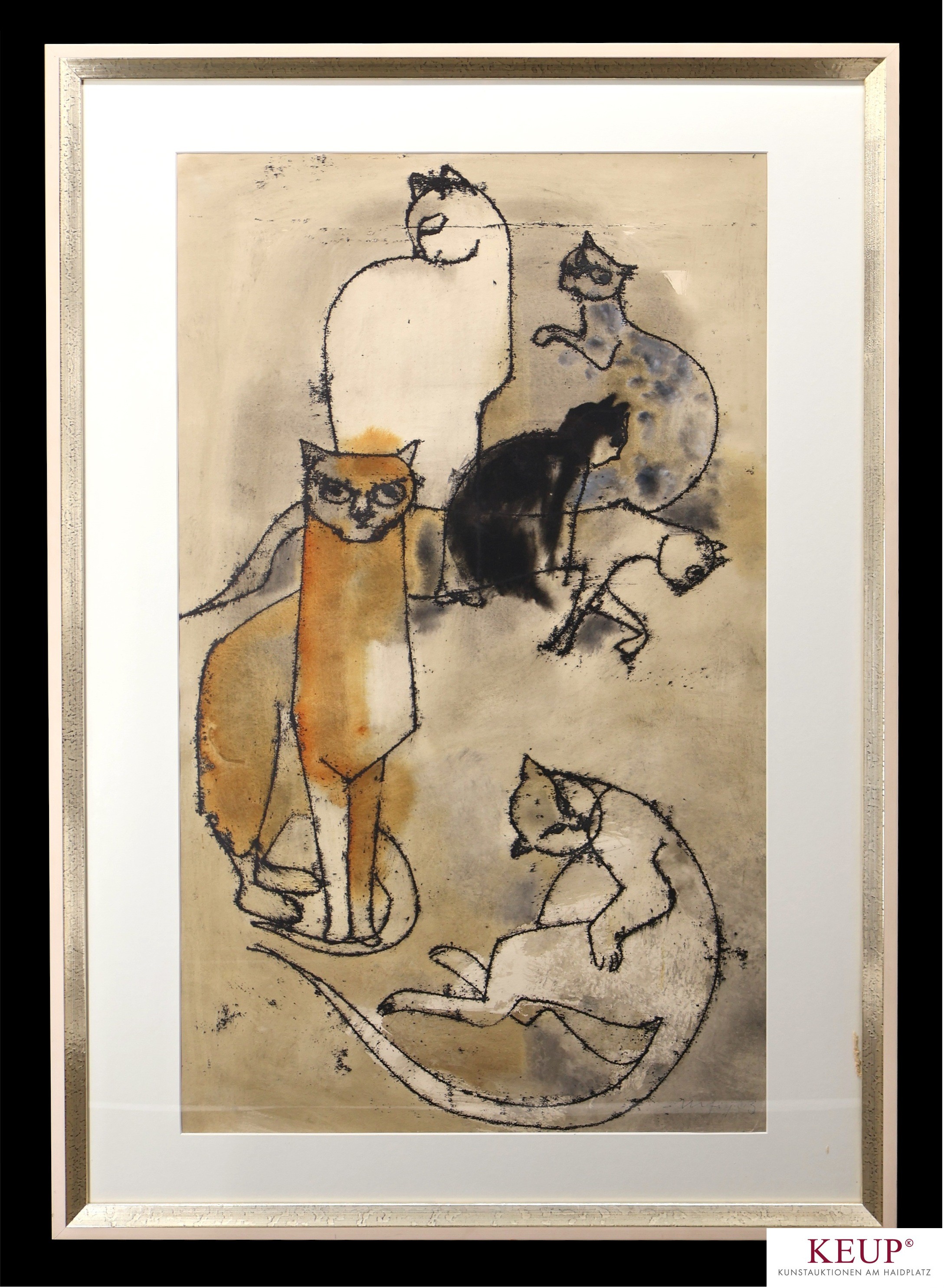 Monotypie - Willi Ulfig (1910 Breslau - 1983 Regensburg) ''Katzen'', signiert, datiert (19)63, Rückseitig mit Entwurfszeichnung, Maße Darstellung ca. 86x51cm, Rahmen, Gesamtmaße ca. 105x74 cm, Provenienz: Privatbesitz Hamburg aus Regensburger Nachlass, vgl. Lit. W.Amann: 1929 Studium an der Kunstakademie Breslau. Zwischen 1940 und 1945 sind alle seine Arbeiten durch Kriegseinwirkungen zerstört worden. Preise: 1965 Ostbayerischer Kulturpreis, 1971 Silb. Lamm, Brixen, 1974 Kulturpreis der Stadt Regensburg, etc.