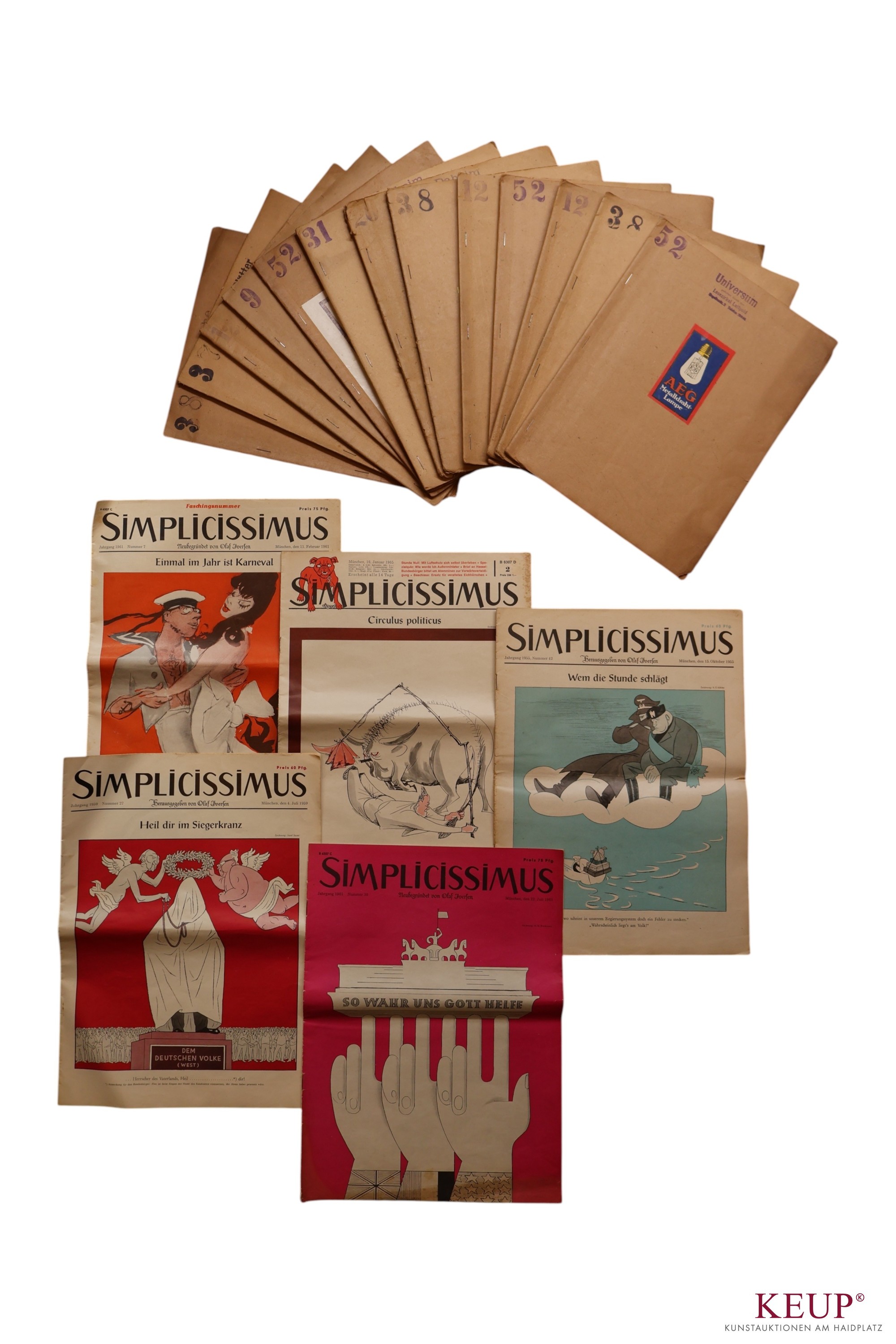 Lot Zeitschriften - XX.Jahrhundert bestehend aus: Simplicissimus 5 Stück, Reclams Universum Kriegsausgabe 3 Stück, Die Woche - Kriegsjahr, Die Gartenlaube, Fliegende Blätter, Kriegsnummer des Daheim 6 Stück, Meggendorfer - Blätter, Altersspuren (teilweise rissig, stark belesen), Provenienz: Privatbesitz Niederbayern