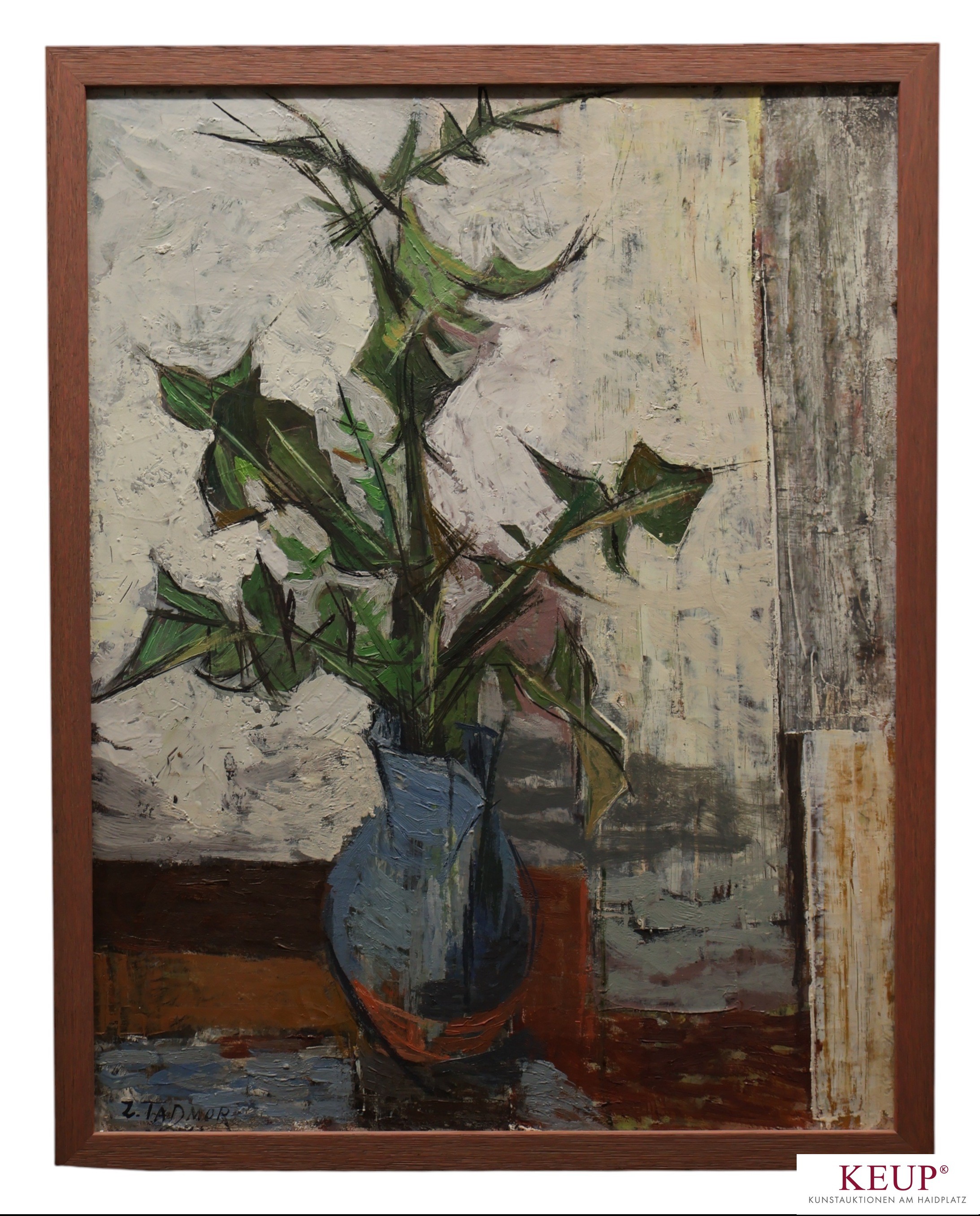 Gemälde - Zvi TADMOR (1923-2012) ''Stechpalmenzweige in blauem Krug'', signiert, Öl auf Leinwand, Maße Darstellung ca. 65x50 cm, Rahmen, Provenienz: Privatbesitz Oberbayern, vgl Lit.: Tadmor emigrierte 1936 nach Israel; wo er am Streichman und Steimatzky Studio studierte. Gründungmitglied der Künstlergruppe ''Zehn''
