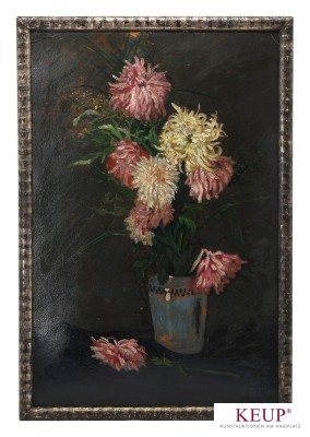 Gemälde - wohl Frühwerk des Künstlers István SZÖNYI (1894 Budapest - 1960 Zebegény in Ungarn) ''Chrysanthemen in blauer Vase'', r.u. signiert SZÖNYi i.und datiert 912. XI., Öl auf Karton, Maße Darstellung ca.68x45 cm , Altersspuren (Karton gewölbt), Rahmen, Provenienz: Privatsammlung Oberpfalz, Vgl. Signatur bei Gemälde Taban of Buda von 1913, Lit.: ''Studium an der Akademie der Bildenden Künste in Budapest, er und seine Familie retteten Juden während des Holocausts; Mitglied der Nagybanya-Gruppe''.